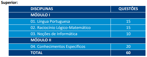 A prova objetiva foi constituída de 40 itens para níveis fundamental e médio e de 50 itens para os empregos de nível superior, avaliada na escala de 0 a 100 pontos.