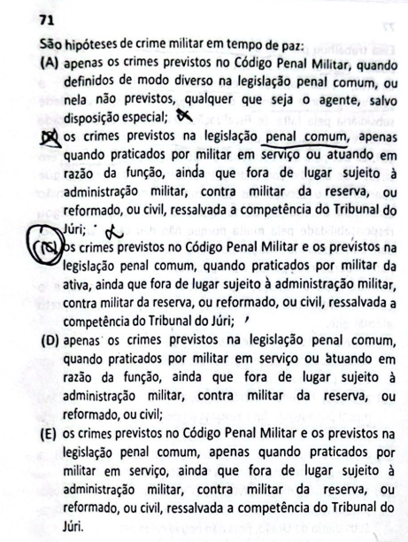 Todavia, verifica-se que não tem nenhuma alternativa correta, vez que a Banca quis restringir as hipóteses de crime militar em tempo de paz. Para corroborar com a argumentação abaixo é colacionado o art.9º, do Código Penal Militar, que traz o que é considerado crime militar em tempo de paz: