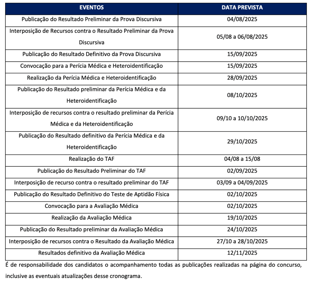 Vale lembrar que o resultado definitivo da prova discursiva está previsto para 15 de setembro e demais etapas já tem datas definidas e divulgadas no cronograma atualizado, confira abaixo: