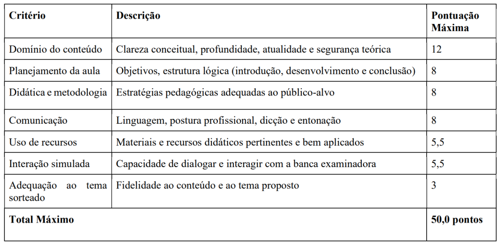 - Prova Didática: de caráter eliminatório e classificatório.