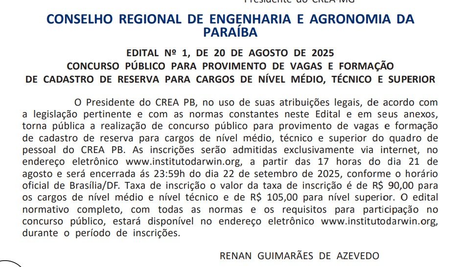 Atenção concurseiro, novo edital em breve! O Presidente do Conselho Regional de Engenharia e Agronomia da Paraíba, Renan Guimarães de Azevedo, torna pública a realização de novo concurso para provimento de vagas e formação de cadastro de reserva para cargos de nível médio, técnico e superior.
