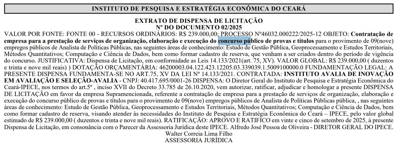 Novidade importante sobre o Concurso IPECE! Nesta quarta-feira, 1º de outubro de 2025, foi definida a banca organizadora do novo edital do Instituto de Pesquisa e Estratégia Econômica do Ceará.