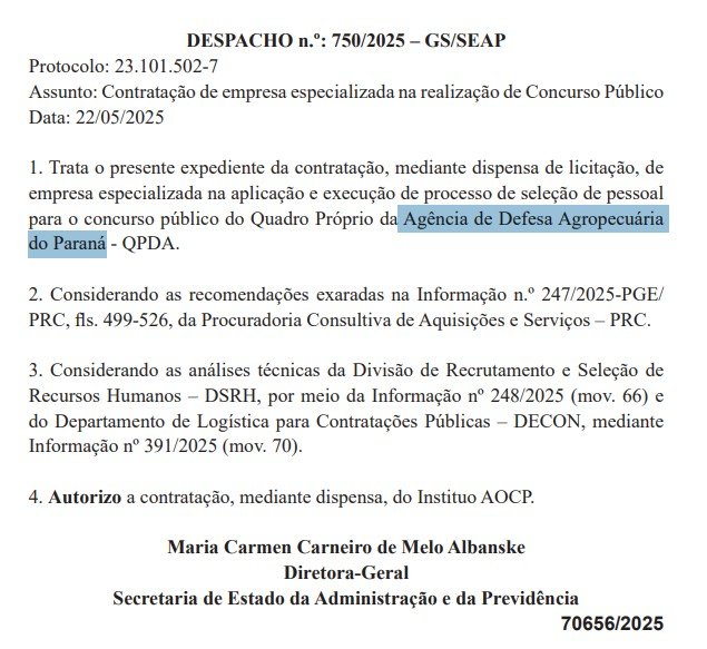 O concurso ADAPAR PR está com banca definida! Foi publicado no Diário Oficial da União o despacho ratificando a contratação direta do Instituto AOCP como banca organizadora do novo certame da Agência de Defesa Agropecuária do Paraná.